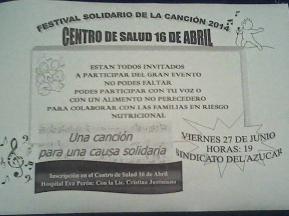 TE INVITAMOS A QUE TE INSCRIBAS EN NUESTRO CENTRO DE SALUD 16 DE ABRIL O EN EL HOSPITAL EVA PERON CON LA LIC. CRISTINA JUSTINIANO PARA EL 3° FESTIVAL SOLIDARIO DE LA CANCIÓN ESTE VIERNES 27 A HORAS 19 EN EL SINDICATO DEL AZUCAR.¡¡¡ AH E INVITA A TODOS TUS AMIGOS A PARTICIPAR!!!